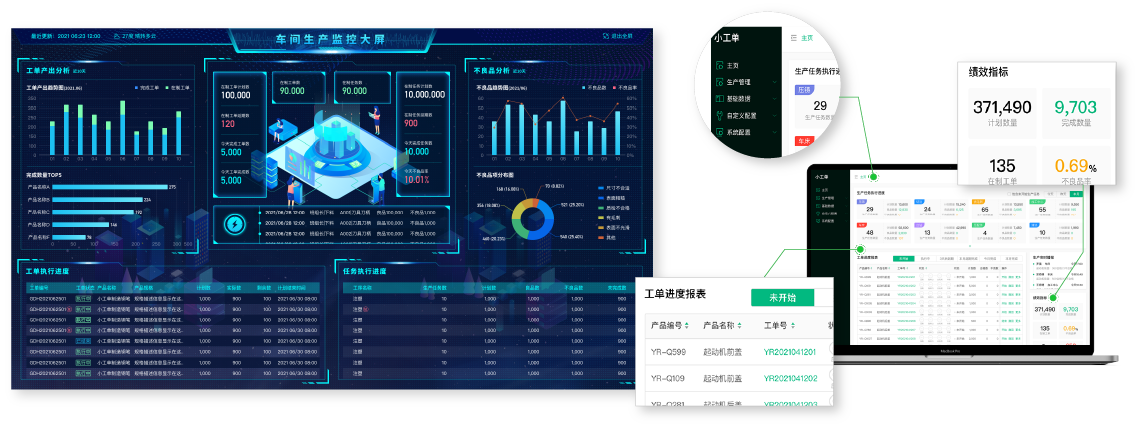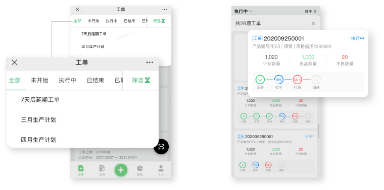 工单进度趋势,报工实时播报,员工绩效,延期预警,